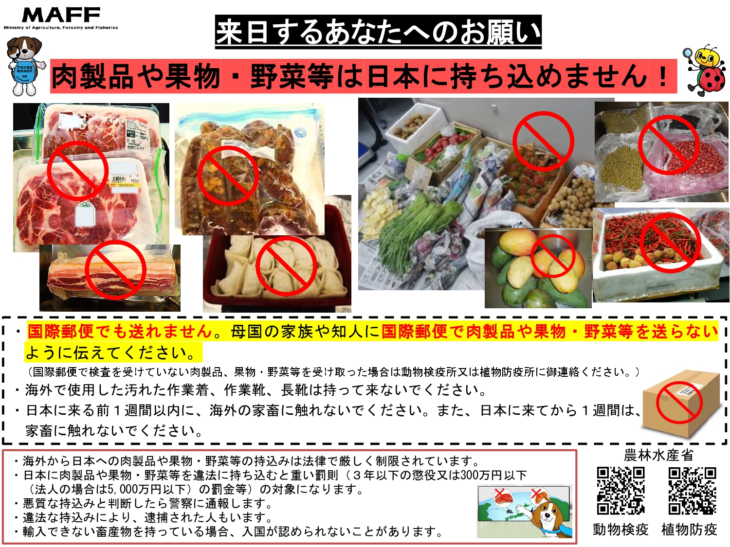 日本に肉製品や果物・野菜等を違法に持ち込むと、重い罰則(3年以下の懲役又は
